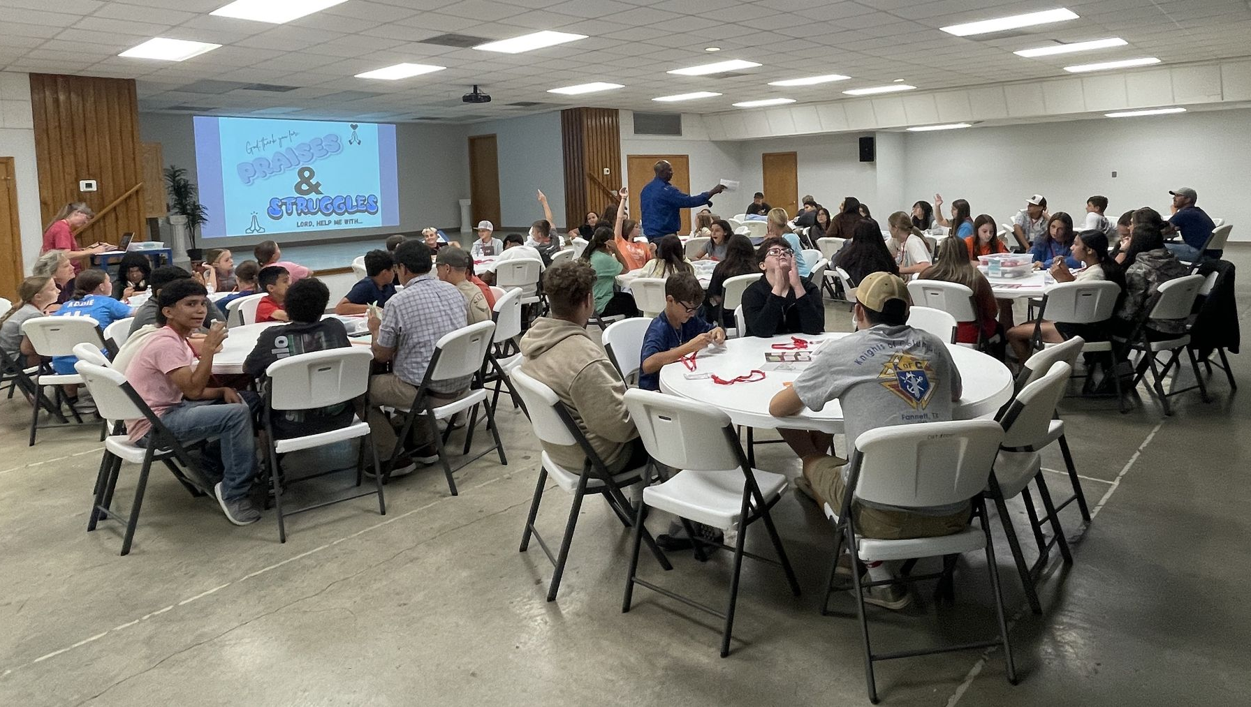 Jr High youth, 6th -8th grade meet in the parish hall and sit in small groups of 4-8 youth with one adult small group leader per table.